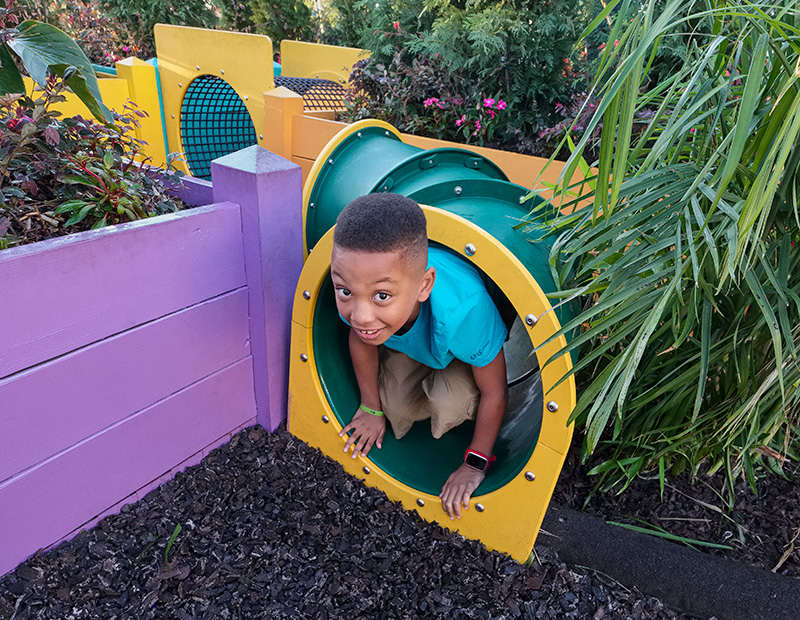 New to the Festival this year is the Imagination Garden, which integrates play into the natural environment. Nestled among the flowers, trees and other landscaping elements is a maze of play. Kids of all ages can navigate the playground tunnels to discover fossil digs and Rhapsody® Outdoor Musical Instruments. Upon finding their way out of the maze, kids ages 2 to 5 find more playground fun with the hillscape climber, pod steppers and leaf panels while kids ages 5 to 12 can traverse their way up and around the Lunar Burst® Net Climber. The play space design truly plays off the aesthetics of the surrounding landscape design.