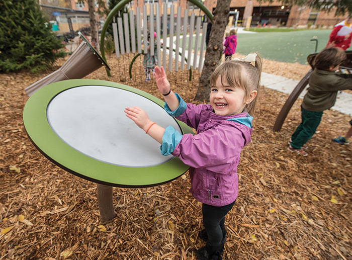 Designate areas for storytelling and reading within the playground. Install benches, small libraries or even mini amphitheaters where children can gather for storytime. We also love incorporating Talking is Teaching panels from Too Small to Fail into the playground design. Story trails along a walking path also encourage children and caregivers to talk, read and sing with each other. Encouraging literacy in a playful environment fosters a love for reading and language development.