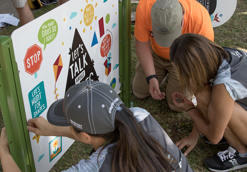 Designate areas for storytelling and reading within the playground. Install benches, small libraries or even mini amphitheaters where children can gather for storytime. We also love incorporating Talking is Teaching panels from Too Small to Fail into the playground design. Story trails along a walking path also encourage children and caregivers to talk, read and sing with each other. Encouraging literacy in a playful environment fosters a love for reading and language development.