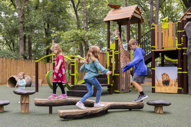 [video: scene fades into a full view of the “Y” shaped nature inspired log balance beams. Scene switches to a close-up of the end of the log balance beam showcasing the realistic concrete made bark and age rings. Scene switches to a pulled back full view of the end of the log balance beam. Scene switches a young girl as she walks across the log balance beam. Scene switches to a view of a boy’s legs as he straddles and sands on the “Y” shaped balance beam. Scene switches to a side view of a boy as he walks across the balance beam. Two boys play at the end of the beam where the boy walks towards. Scene switches to a straight on view as a boy walks across the balance beam away from the camera. A boy squats at the end of the beam as a woman sits on a log sitting bench. Scene switches as the camera zooms out from a young girl holding on to an adult’s hand while she walks across the balance beam. Camera pulls back for a full view of the balance beam where children walk in all different directions. Scene switches to