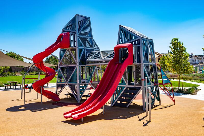 Two towers double the climbing challenges and are linked by an elevated crawl tunnel for an exhilarating scramble from one tower to the other. It’s a physical and social wonderland where imaginations can literally soar. Alpha Link® Towers let kids experience heights in a safe way. Multiple climbers offer different routes up the outsides of both towers to the 4’ and 8’ level. Kids can climb all the way to the fully enclosed 12’ deck on the inside of the largest tower. Two of our most fun slides – the Double Swoosh Slide® and the WhooshWinder® Slide – bring them back down to earth. The funky geometric design of the playstructure and contemporary patina of the Hot Dip Galvanized (HDG) steel frame will turn any playspace into a destination playground. Kids will love finding all the unique lookout spots along with the shaded spaces inside for relaxing and socializing. Parents and supervisors will appreciate the perforated and slotted panels that offer clear sightlines.