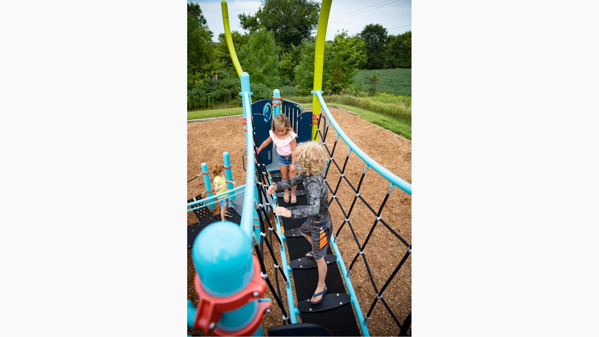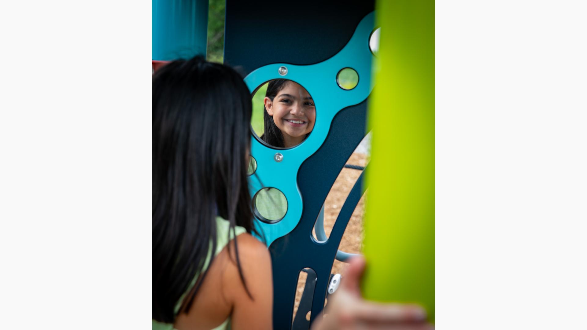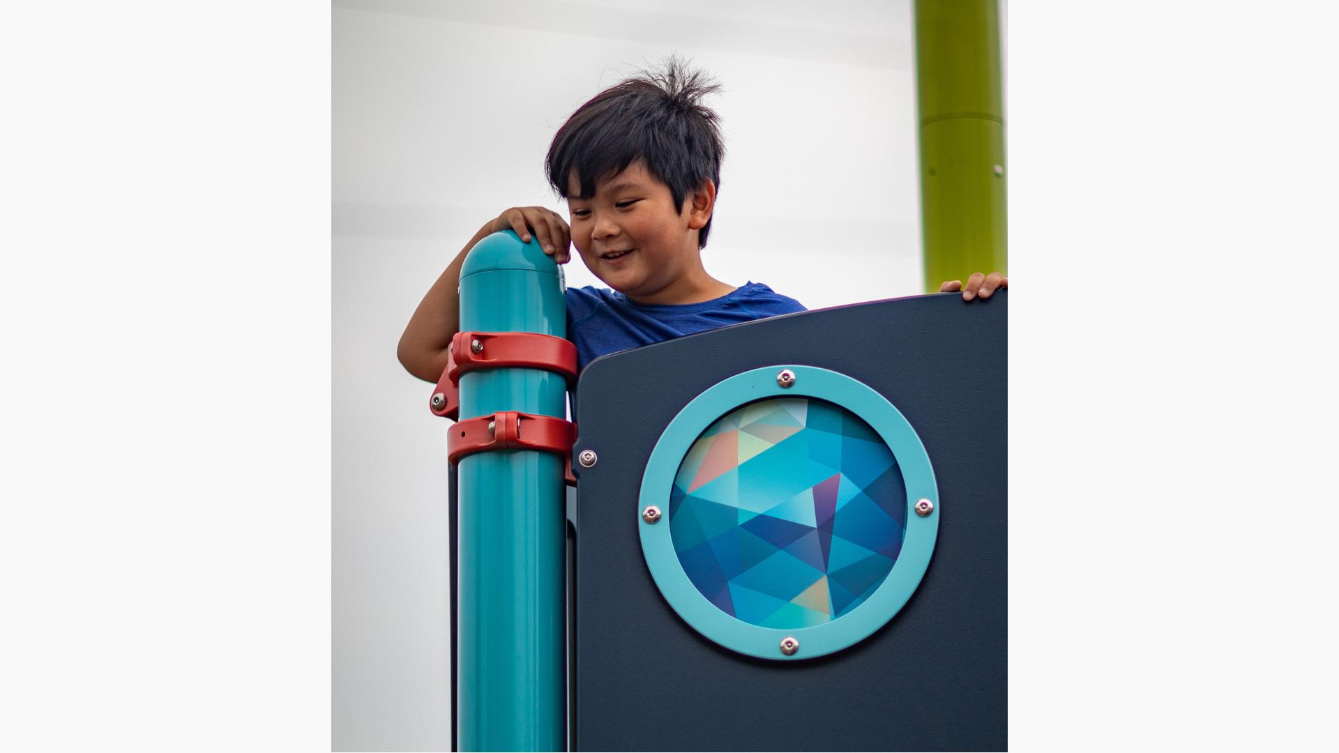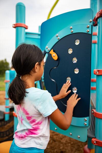 [video: a young girl climbs across an arch belted climber to a rope climber connecting to the playground decking. The camera focuses on a girl as she plays with small orange fish that slide up and down a play panel. The camera zooms in to the girl’s hand as she slides one of the orange fish up the panel. Scene switches to a girl as she riders down the large wide slide of the play structure.]