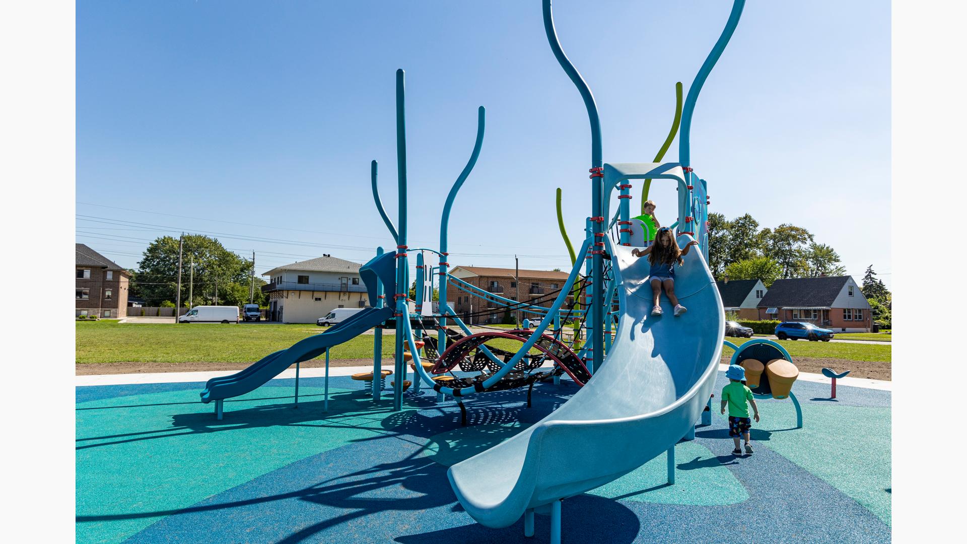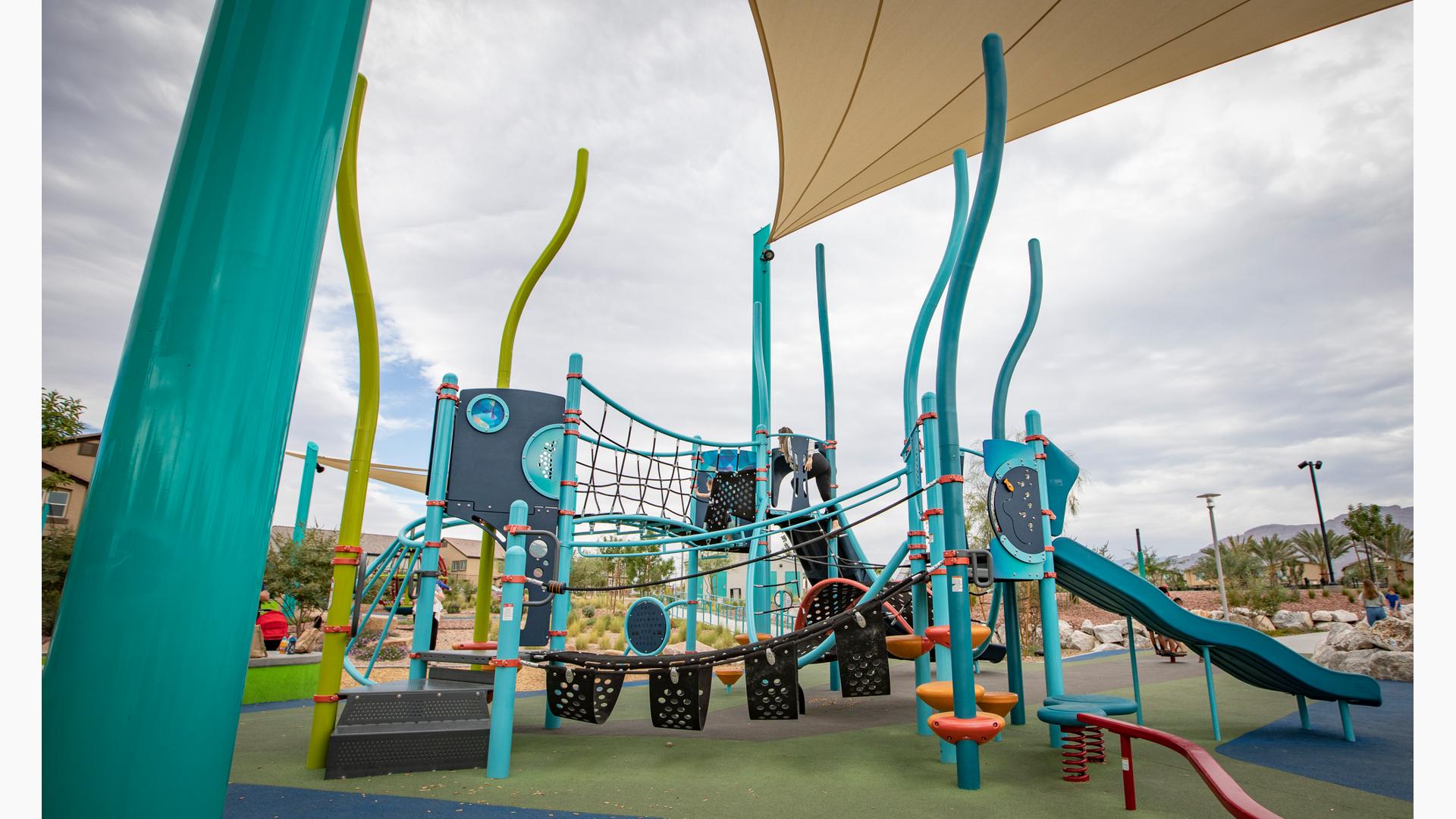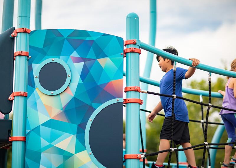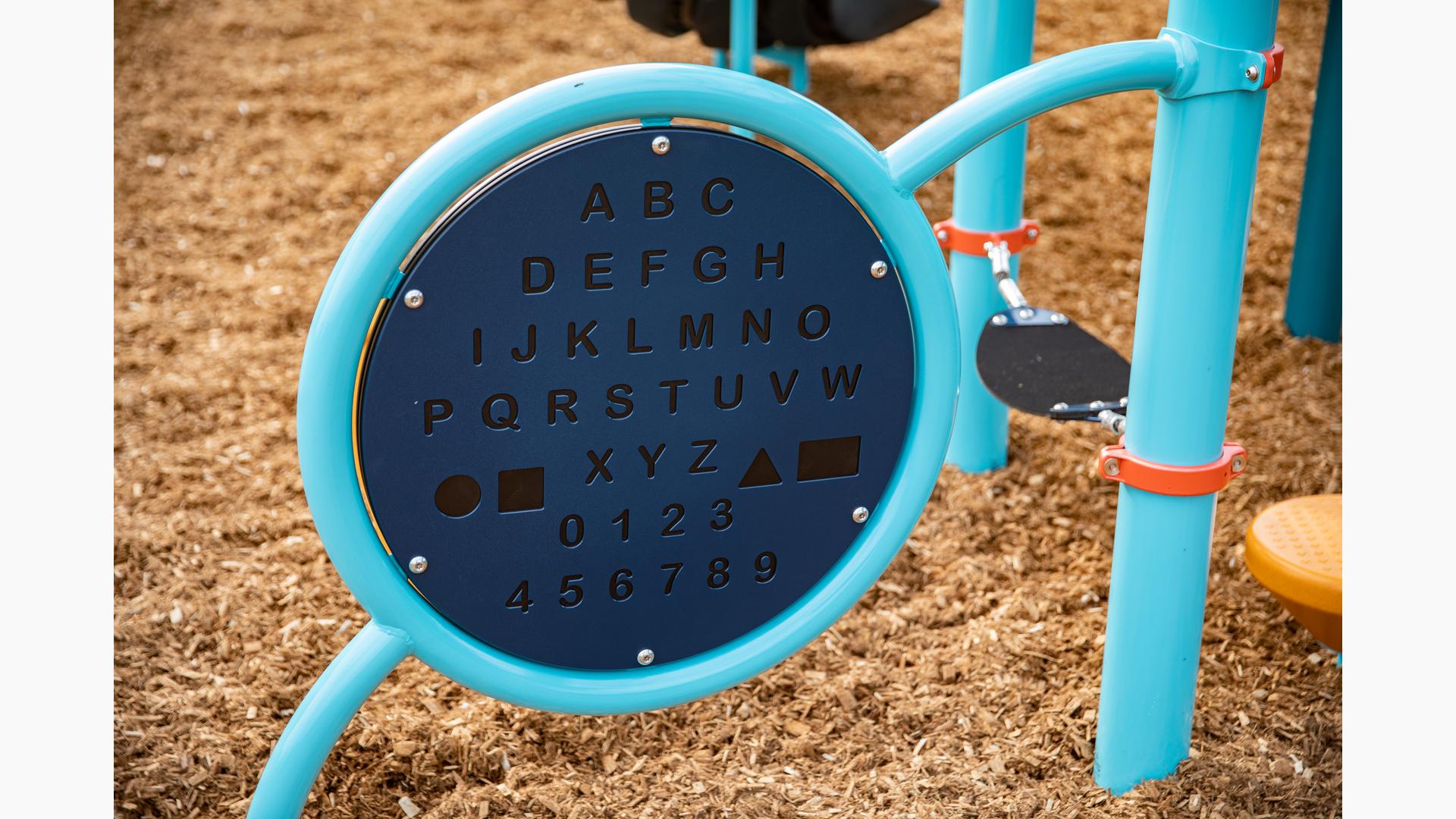 [video: a young girl climbs across an arch belted climber to a rope climber connecting to the playground decking. The camera focuses on a girl as she plays with small orange fish that slide up and down a play panel. The camera zooms in to the girl’s hand as she slides one of the orange fish up the panel. Scene switches to a girl as she riders down the large wide slide of the play structure.]