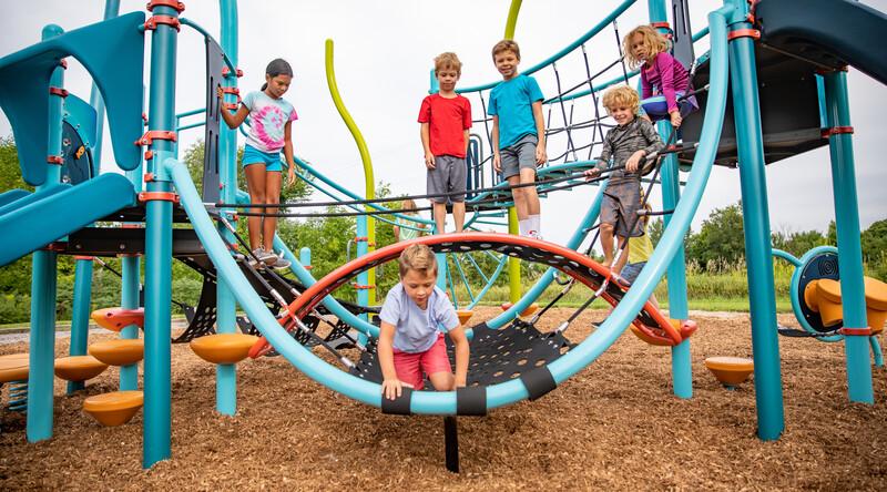 [video: two girls ride side by side on a double waved slide. A boy hands upside down from the arched belted climber. He holds onto the rope side rails as he talks to a girl standing nearby. Scene switches with a boys’ back to the camera. Kneeling and playing with the fish slider play panel. Camera switches to a view of the top of the large blue slide from the playground decking. A boy rides down the wide slide. A second boy sits down at the top of the slide.]