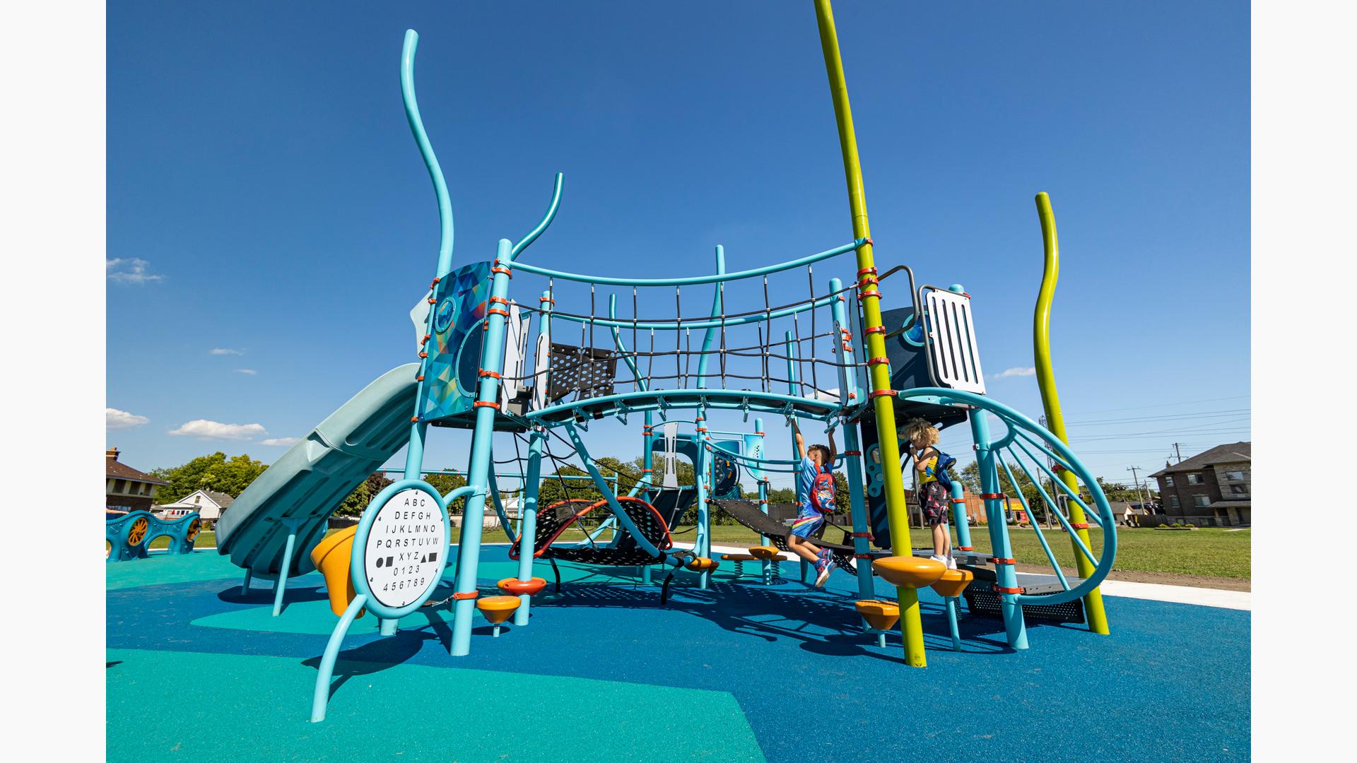 [video: scene begins as light music plays in the background. A view of a playground post with two half circle shaped sign panels welcoming guest to the playground. The sign panels have playground information and warnings listed on them. Camera switches to an elevated full view of the play area equipped with the BeachComber® beach wave themed play structure and inclusive four-person seesaw and multiple rider spinner. Scene switches to a ground view of the BeachComber® structure. A girl bangs on a drum panel. Scene switches to a girl as she swings from rung to rung of a monkey bar set underneath an overhead bridge. Camera switches to a view of the play structure at the bottom of a large wide deep blue slide. Children climb and play all over the structure.]