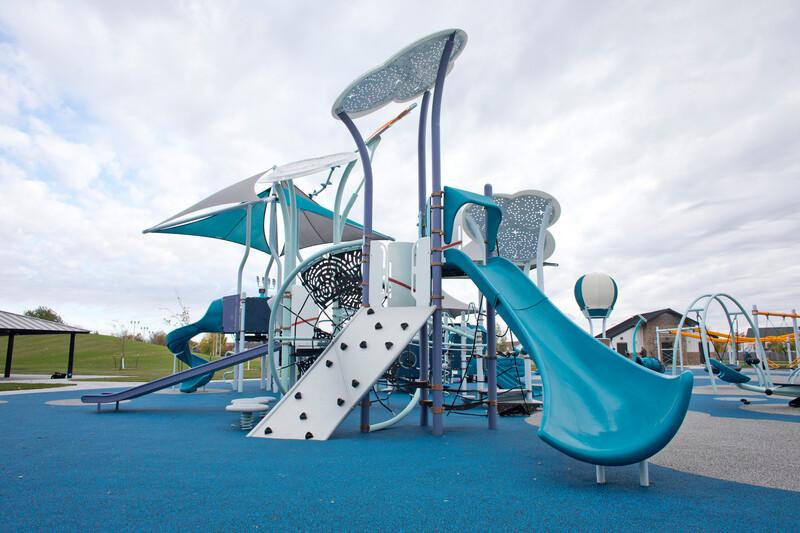 Built-in shade floats above like clouds, encouraging imaginations to soar. Kids can bounce their way across the sky on the SwiggleKnots™ bridge, achieve dynamic new heights via the attached Mobius® Climber and enjoy a rich sensory experience on the Rollerslide. Add an iconic kite, a rainbow of hot air balloons and a slew of unexpected shadow surprises, and you’re ready for take-off.