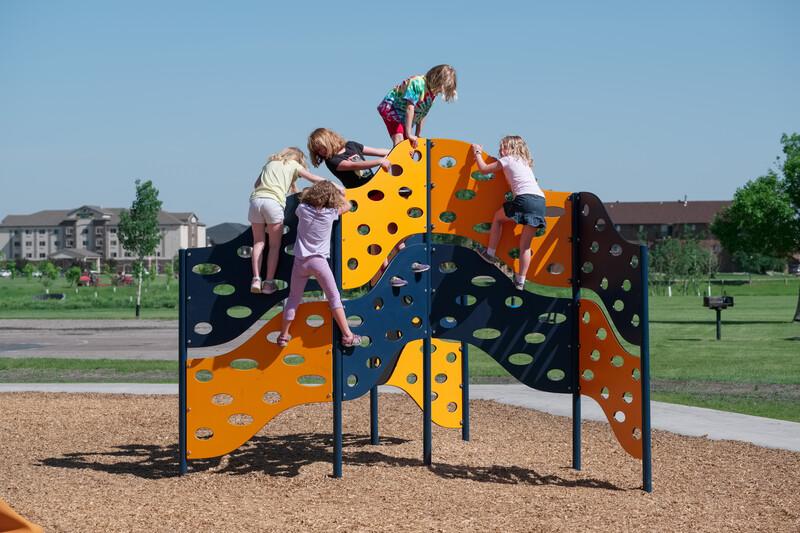 [video: fade onto children climbing up the Cascade climber made of Permalene panels with hand a foot hold cutout. Camera close-up of a girl’s feet standing in the foot holds of the climber. Camera switches to a view of two children’s backs as they climb up the climber. Camera switches to a front view of a girl as she squints over the top of the climber. Camera switches to a ground view up to children as they climb up the climber. View pulls back for a side view as children climb on either side of the Cascade climber. Camera zooms in on a girl as she climbs. Here hair blows in the breeze. A woman cheers off camera while the children climb.]