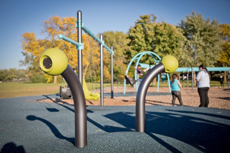 [video: camera switches to a young boy speaking into chatter noodle talk tube.] Young boy: What are you doing? [video: he lifts his head away from the talk tube to look across playground. He turns back to young girl standing by him and giggles into his hand. Fade to black.]
