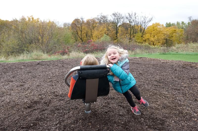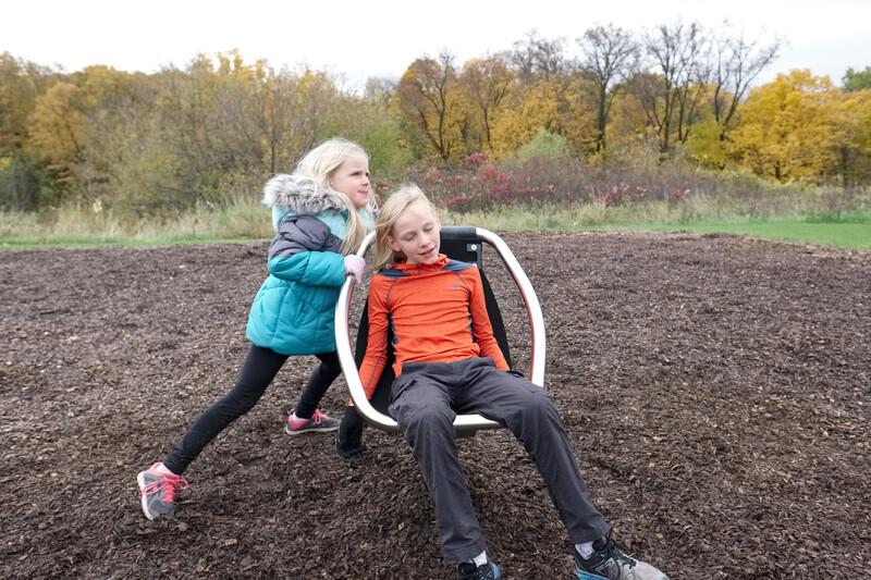 [video: young girl sits in spinner chair while older boy spins her quickly. Young boy hick ups while spinning the chair.]