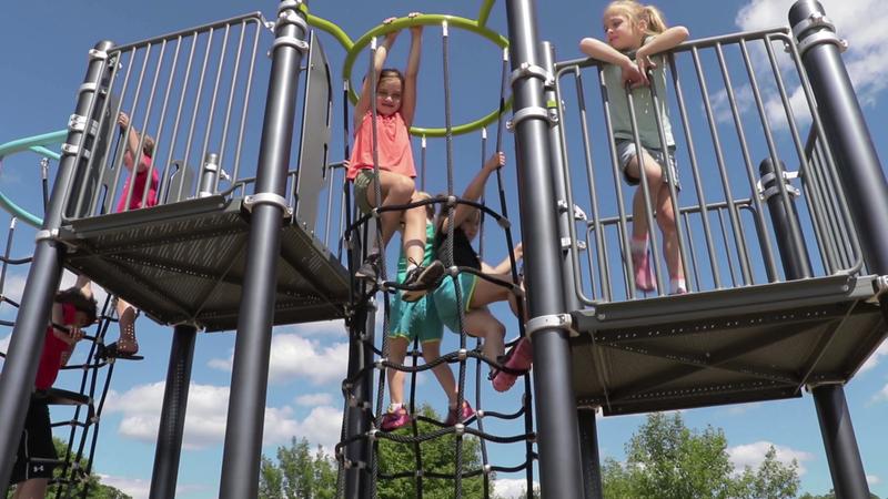 [video: scene switches to a top down view as a boy climbs up the chimney climber. Scene switches as the camera follows a girl as she climbs up he climber. Camera switches to a view through the ropes of the climber of a boy as he climbs. He sees the camera and smirks as his eyes get wide he says hello to the camera. Scene switches to a view across the play area as the boy climbs down the chimney climber. Scene fades to black as a girl climbs down the chimney climb across in slow motion.]