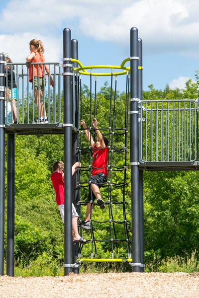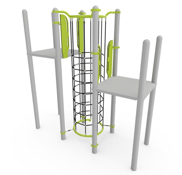 This rugged cable matrix allows kids to climb from the ground up, exploring inside and outside as they travel between two decks. Sparks imaginative fun along with rambunctious activity.