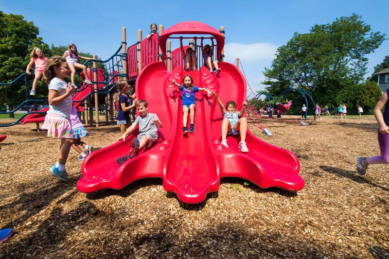 [video: the scene fades back to a front full view of the slide as three children giggle and slide down together. Scene fades to a ground view up at the bottom of the slide. Three children slide down towards the camera.]