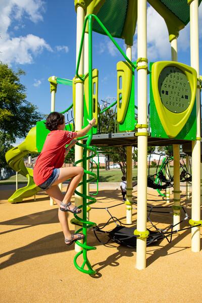 [video: scene fades into a boy as he sits on the Corkscrew Climber and spins himself down the spiral bar.]