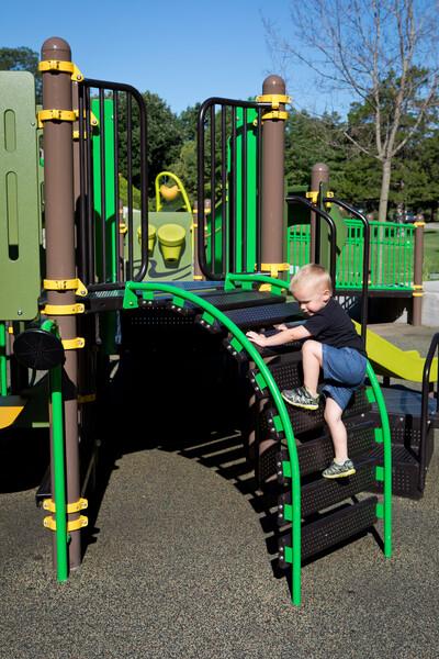 [video: scene fades into a boy as he climbs up an arched playground climber with evenly spaced playground decking planks. He holds onto the lime green handhold bars that curve with the shape of the climber. He uses the spaces between the deck planks to climb up the climber. The camera pulls back for a full view of the Cozy Climber as the boy continues to climb. Scene switches to a top-down view from the playground decking as the boy climbs up the climber. Scene switches again as they boy sits on the top of the climber and slowly sliding down the arch of the climber’s planks. The camera focuses on the boy’s feet as he steps between the spaces of the climber planks. The boy then climbs down the climber the same way he climbed up it. He slowly lowers himself down to the ground by sliding on his belly. Screen fades to black and the video ends.]