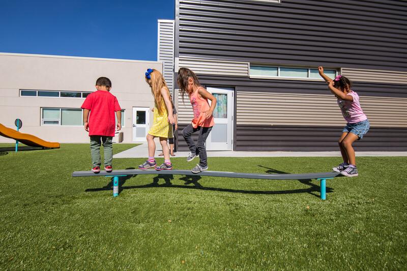 Video features children playing in a freestanding playground curved balance beam.