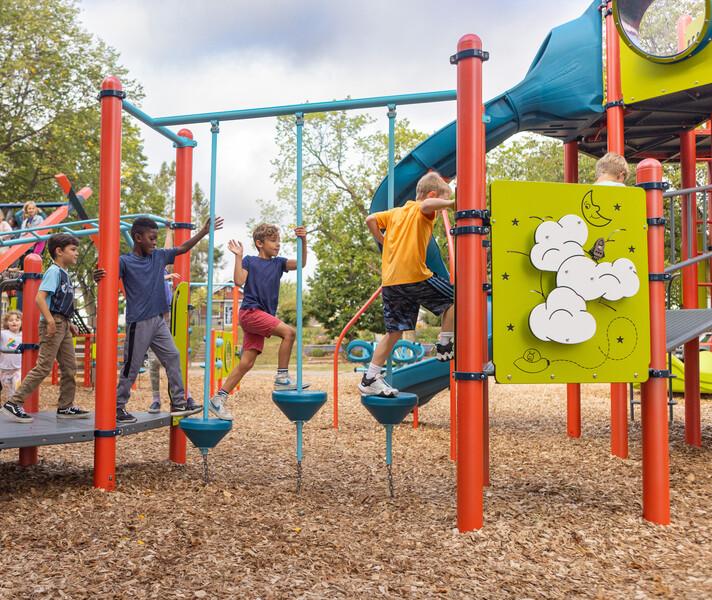Durable poly discs create a fun, challenging way to get across the playground with the PlayBooster® Disc Challenge bridge.Features
