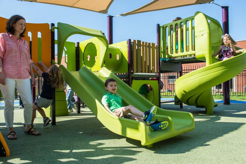 [video: the two children slide down the slide together.]
