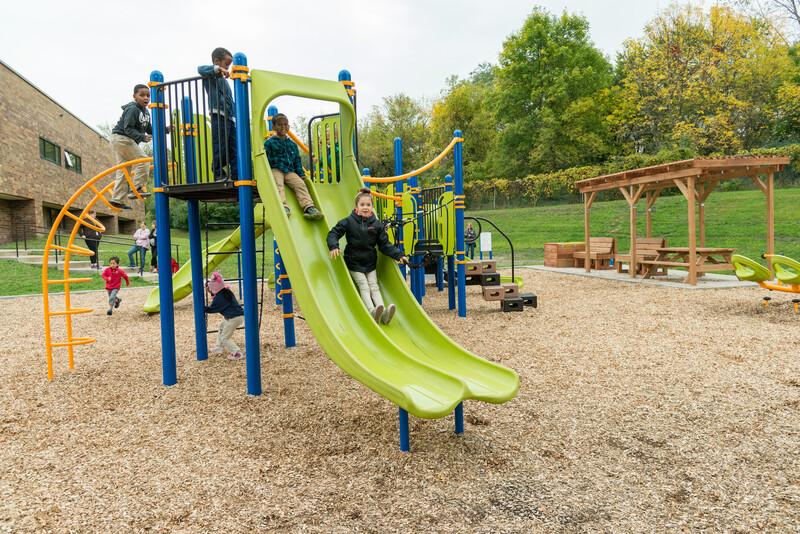 [video: camera zooms out as two children go down double swoosh slide. Fade to black]
