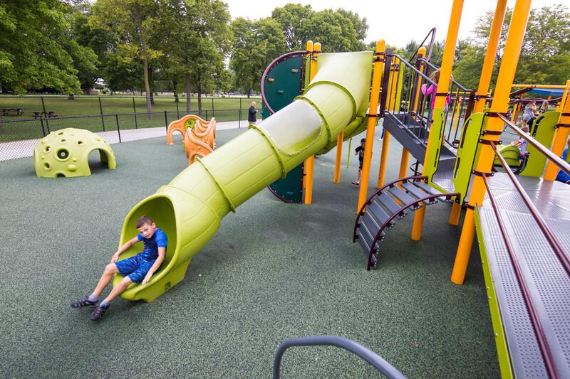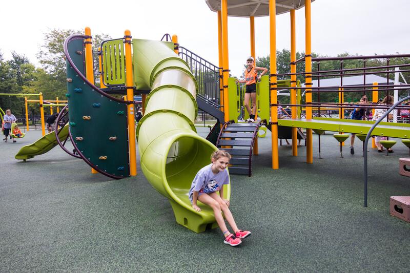 [video: a young girl holds onto the hand hold bar at the top of the slide swinging her legs down the entrance. She hangs there for a bit. Scene switches to the camera sliding down the El Slide. Scene fades into an elevated view of the slide skylights as a girl slides down the slide. The camera pulls back for a full view of the slide as children wait in line at the top of the playground decking. A young boy slides down the slide and jumps to his feet at the bottom. Scene fades to black.]