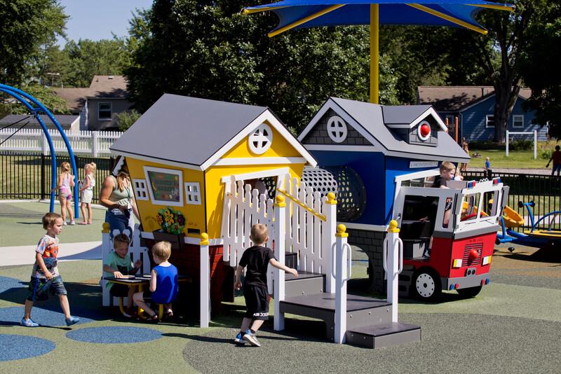 Pairing a Fire Station and a Market Café through a connecting elevated crawl tunnel gives kids two iconic structures to exercise their imaginations. Whether keeping shop, making food, taking care of the fire station pet dog, or zooming to an emergency, young ones will delight in the many physical, imaginative, and learning activities they find while playing.