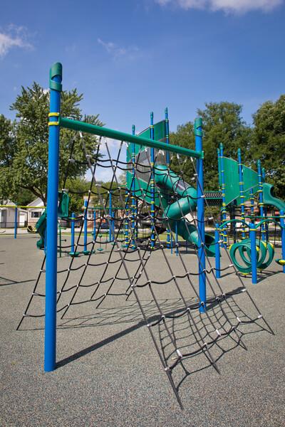 [video: camera zooms out to whole view of playground. Fades to Landscape Structures logo.]