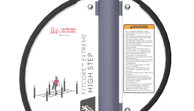 [video: Landscape Structures logo blank background. Text banner slides to middle of video text reads: FitCore Extreme challenge your athletic abilities.]