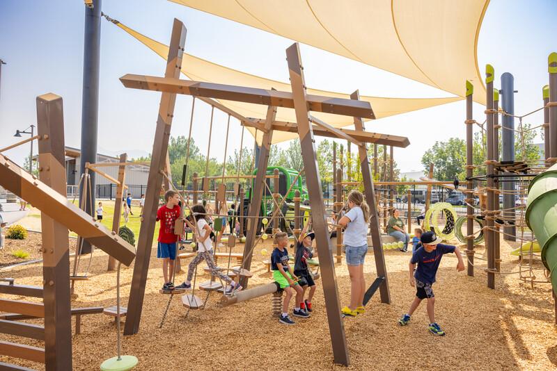[video: Camera switches to a elevated view of the play area slowly panning left to right as children and families play on the several play structures. These play structures are designed in a blue and light grey color scheme. White text at the bottom of the screen reads “Ages 2 to 5”. Camera switches to a higher full elevated view of the play area back to the play structures with the copper and purple color scheme. Children play on the different play activities of the structures. White text at the bottom of the screen reads “Ages 5 to 12”. Scene switches to a full elevated view of the “A-frame” shaped play structure. Children run and climb across the belted bridge of the structure. White text at the bottom of the screen reads “Fortress™ Multi-Climber/ 5 to 12”. Scene switches to a new play structure with four slightly angled vertical beams and two horizontal beams. Ropes connect down to different high foot steppers while there is a small slightly curved belted bridge on the ground in the center of the play structure. Children play on the foot steppers. White text at the bottom of the screen reads “Foxtrot Multi-Climber/ 2 to 5”. Scene switches to a simple play structure with two slightly angled vertical beams with a single cross beam. Four ropes suspend down from the cross beam each with a different play panel. Two girls and their mother play at the play panels. White text at the bottom of the screen reads “Focal™ Sensory Wall/ 2 to 12’. Scene switches to a structure where two angled beams make the peak of a triangle as connecting ropes make up a climbing web. Children climb all over the ropes. White text at the bottom of the screen reads “Forge™ Climber/ 5 to 12”. Scene switches to a simple swing set frame made up of the unique angled beams. A boy and girl swing on the swing set. White text at the bottom of the screen reads “Forma™ Swing Frame/ 2 to 12”. Scene switches to children climbing across suspending ropes with foot steppers at the bottom form a square play structure frame. White text at the bottom of the screen reads “Folio™ Balance Climber/ 5 to 12”. Scene switches to a boy and girl standing and wiggling on a triangular shaped base with suspended support ropes. Text at the bottom of the screen reads “Forma™ Giggler Jiggler Climber/ 2 to 5”. Scene switches to a boy riding down towards the camera on a large blue curved slide. White text at the bottom of the screen reads “Forma™ Alpine® Slide/ 5 to 12”. Scene switches to a boy playing at a sound rain panel suspended by ropes from a play structure. A girl and boy play on a stand-up spinner in the background. White text at the bottom of the screen reads “Forma™ Sol™ Spinner/ 5 to 12”. Scene switches to a simple play structure frame with two slightly vertical beams and a single connecting horizontal beam. Two large open circular seats with belted seating areas are suspended by ropes from the main cross beam. A boy sits lounging in one of the circler seats. White text at the bottom of the screen reads “Fox Den™ Hangouts/ 2 to 12”. Scene switches to a focused view of varying height foot steppers made from artificial looking wood planks. A boy’s shoes can be seen stepping from the tallest stepper down to a lower one. White text at the bottom of the screen reads “Footprint™ Steppers/ 2 to 12”. Scene switches to a girl as she holds her hands out to her sides balancing on a balance beam. She walks down the balance beam and steps off onto a foot stepper. White text at the bottom of the screen reads “Footprint™ Balance Beam/ 2 to 12”. Scene switches to a focused top view of a wobble pod made up artificial looking wood planks. A child’s feet step up onto the wobble pod and it begins to wiggle. White text at the bottom of the screen reads “Footprint™ Wobble Bouncer/ 2 to 12”. Panels of a blue toned image fill the screen. The image is a close-up of a foot hold of a rope ladder with the Landscape Structures ribbon logo embossed on the side of the foot hold. White text appears in the center of the screen one word at a time reading “From the experts”.]