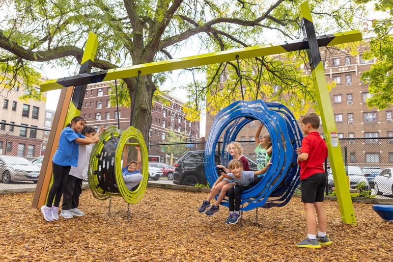 [video: rectangular planks fill the page making up a photo with a purple overlay. The image is a focused view of a balance beam wrapped in rope on a wobble spring with additional support ropes on each end. White text in the center of the screen reads “Sensory Rich”. Rectangular planks fill the screen showing the next scene of a girl as she slides a shape on a horizontal rope to a cluster of other shapes on the rope. Scene switches to a girl as she stands and looks into a play panel mirror. Scene switches to a boy as he rotates the center of a play panel with three connecting hour glasses. Scene switches to a focused look of a child’s feet standing on the rope wrapped balance beam. It wiggles bag and forth as the child moves. Rectangular planks fill the page making up a photo with a green overlay. The image is a focused view of rectangular small panels on vertical ropes. White text in the center of the screen reads “Inclusive”. Rectangular planks fill the screen showing the next scene of children of all abilities playing on a play structure. The camera focuses closer into the scene of a boy transferring from his wheelchair to sit on the rope wrapped balance beam. His mother holds him as he sits and wiggles on the beam. Scene switches as the camera pans left to right showing smiling playing children on different play activities. Scene switches to a boy seating in his wheelchair as the turns the wheel of a rain sounds panel. Scene switches to children running up the spiral belting leading up to a playground slide. A mother kneels neck to her son in his wheelchair as they look at the transfer station at the bottom of the spiral belting leading up to the slide. Rectangular planks fil the page making up a photo with a light blue overlay. The image is a focused view of ropes connected to a horizontal cross beam of a play structure. White text in the center of the screen reads “Open sightlines”. Rectangular planks fill the screen showing the next scene of a girl jumping across the ground arched walking bridge of one of the play structures. Scene switches to a panning view left to right of children playing on the “A-Frame” like play structure and in the foreground a boy runs up to the steps of the play structure, then running up the spiral belt walkway leading up to the top of the large blue slide. Rectangular planks fill the page making up a photo with a grey overlay. The image is a close-up of a horizontal rope with varying shapes panels strung on it. White text in the center of the screen reads “Endless color options”. Rectangular planks fill the screen showing a render animation of a Forma playground set in the center of a city. The playground color scheme is bright orange and accented with blue. Scene switches to a render animation of a Forma Playground set in a forest landscape. The playground color scheme is different shades of green. Scene switches to a render animation of an urban setting of a Forma playground. The playground color scheme is black and accent with teal. Scene switches to a render animation of a open Southwestern location with a Forma playground. The color scheme of the playground is different shades of orange with white accents. Scene switches to a render animation of outer city park with the city scape in the background. The Forma playground has a black and white color scheme. Scene switches to a render animation of a Nature Park setting with a Forma playground. The playground color scheme is a light tan with accents in orange. Scene switches to a render animation of a Forma park playground with a color scheme of light purple and accented with light grey. The scene change quickly speeds up showing many different render animations of possible Forma playground color schemes and locations. Rectangular planks fill the screen making up an image with a orange. The image is of the top of a Forma play structure. White text in the center of the screen reads “Exclusively from”. Rectangular planks make up the next scene of children playing on the Forma slide. A boy rides down the large blue slide in slow motion.]