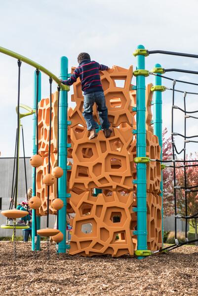- Climbing panels include a variety of hand and foot holds to encourage strategic planning