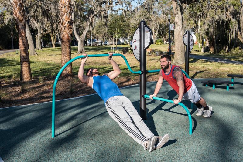 Video features the Health Beat outdoor exercise equipment Assisted Row and Push Up system.