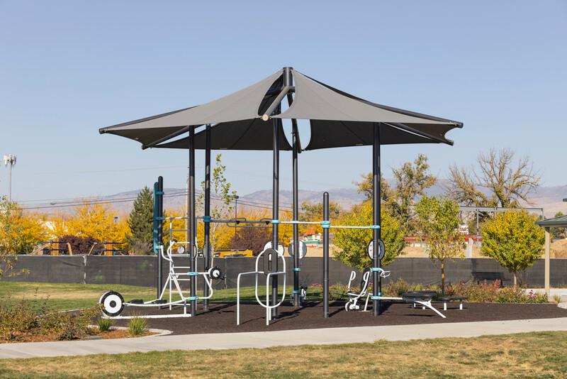 Fitness equipment for strength, cardio, balance, and flexibility training engaging all muscle groups are all covered by integrated shade to provide protection from the sun while exercising. An included Welcome Sign features a library of movements with a scannable code linking to instruction videos on FitLot.org.