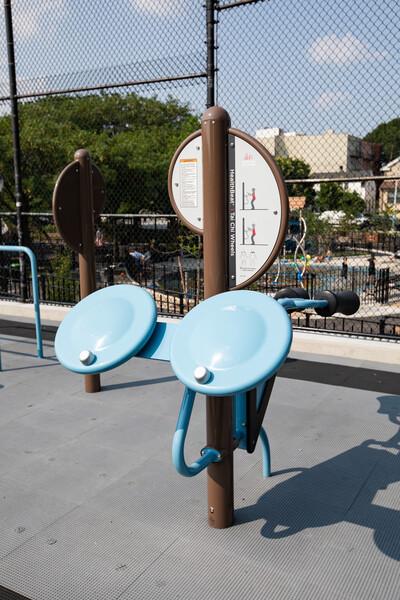[video: scene fades into a close-up of the Tai Chi Wheel station informational sign with suggested body placement and movements. Scene switches to a back view of a man as re rotates the Tai Chi Wheels in a counterclockwise motion. The camera zooms in on his hands as he lightly rotates the wheels with the palms of his hands. The camera switches back to a view of the man’s back and upper body as he rotates the wheels. A man walks up the steps and down the ramp of the Mobility station connected to the Tai Chi Wheels. Scene switches to a side view of a woman seated in a wheelchair as she rotates the wheels at the station. She smiles and laughs as she spins the wheels. Camera switches to a back-side view of another woman as she stands and rotates the wheels. The camera switches to a front view focusing on the woman’s faces as she rotates and looks down at the Tai Chi Wheels. The camera switches to a close-up of the Tai Chi Wheels as she rotates the wheels in different directions. The camera switches again to a