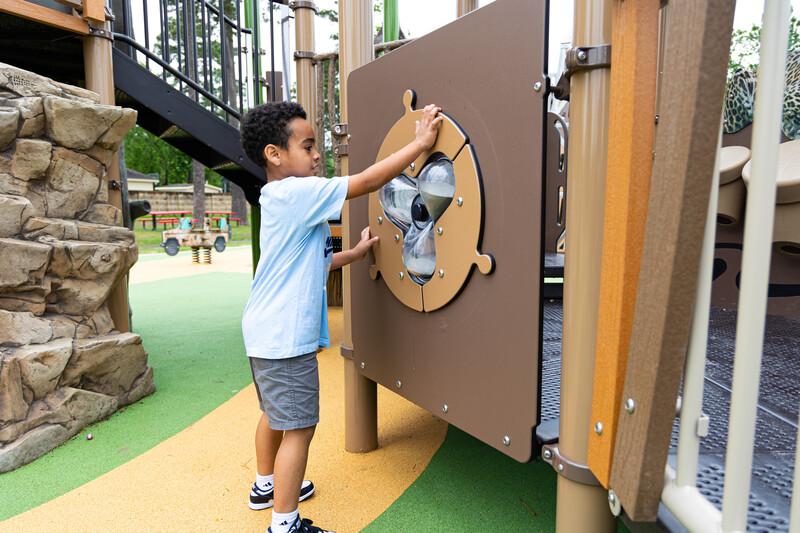 [video: scene fades into the camera slowly zooming in on an Hourglass Panel on a Treehouse themed playground. Three hourglass shapes connect on a spinning panel filled with sand. Scene fades to a boy as he grabs a hand hold of the panel and spins the Hourglasses around. Scene switches to a side view of a younger boy as he spins the Hourglass Panel with both hands. Scene switches to a top down view over the shoulder of a young girl as she slowly spins the panel. She looks down at the hourglasses as the sand spills from one to the other. Scene switches to a view of the back side of the Hourglass Panel. One boy reaches over the top of the panel and touches one of the hourglasses as another boy stands on the ground spinning the panel. The boy standing on the ground mumbles indistinctly as he plays with the panel. Scene switches to a close-up of the hourglasses on the panel as the sand shifts and moves inside. Scene switches to a blurred view through the hourglasses of a young boy’s face as he looks at the sand inside the panel. Scene switches to a view across the playground decking of two boys as they sit as the Hourglass panel. Scene switches to a close-up side view of a young girls face as she intently gazes at the sand in the Hourglass Panel. Scene switches to a full side view of a Treehouse themed playground with nature-inspired log and mushrooms steppers. Children play all around the playground. One boy stands and spins the Hourglass Panel as the scene fades to black.]