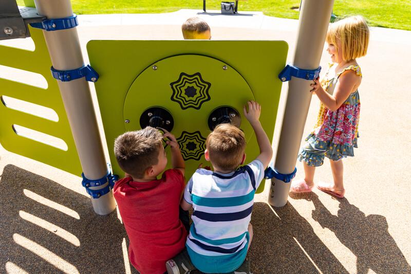 The PlayBooster® Kaleidospin Panel® has rotating prisms and a kid-operated eyepiece that provides engaging visual stimulation. Encourages imaginative play and social interaction.