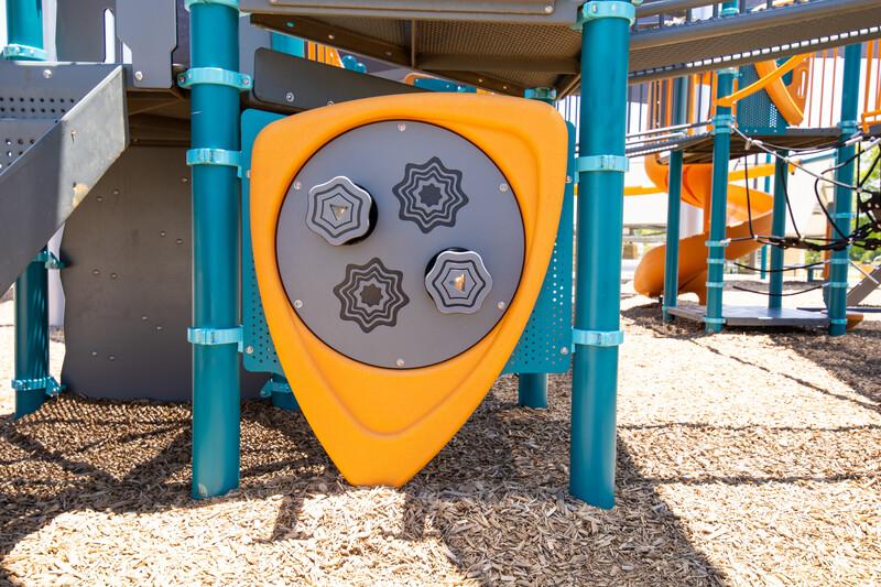 The Kaleidospin Vibe Panel™ has rotating prisms and a kid-operated eyepiece that provides engaging visual stimulation. Encourages imaginative play and social interaction. The Vibe® design is a stylish combination of perforated steel and playful rotomolded plastic that modernizes the traditional post-and-deck playsystem.Features