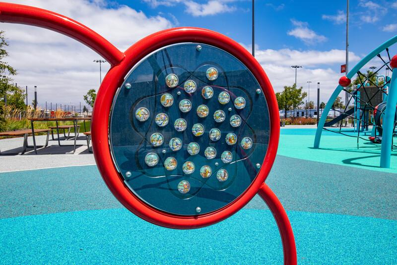 [video: scene fades into an elevated view of children playing all over a Weevos playground as a softball game takes place nearby. Scene switches to a ground view of children as they play all around the Weevos playground on the different activities. Scene switches to a boy as he spins the marbles on a Weevos Marble Panel. The camera switches to the other side of the panel where a girl spins the marbles of the panel with both of her hands. The camera zooms in on the girl’s hands as glides them over the top of the see-through marbles. Scene switches to a toddler as he walks past the panel. Camera switches to a ground view up to a girl as she looks at the ground and rubs her hand on the marbles of the panel. Scene fades to black.]