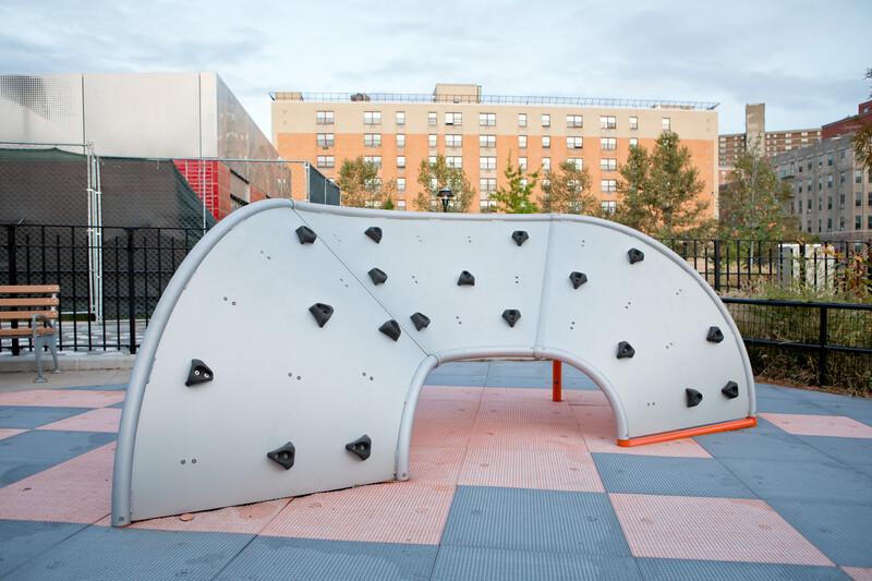[video: camera switches to a full view of children climbing all over the arched Mobius climber. Scene switches to a front view of the Mobius climber. A girl on the climber jumps down to the ground towards the camera. A child and woman speak off camera as the scene fades to black.]