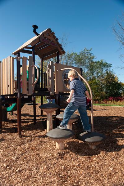 [video: scene fades into a full view of three mushroom steppers varied in height. Scene switches to a ground level pan across the three mushroom steppers. Scene switches to a full view of the three mushrooms steppers. A man holds onto a boy’s hand as he steps up onto the lowest mushroom stepper. A girl walks towards the steppers in the foreground. Scene switches to the man holding both hands of a young boy as he stands on the tallest mushroom stepper while a young girl crawls onto the lowest stepper. Camera zooms in and focuses on the young girl as she crawls from the lowest stepper to the middle stepper. Scene switches to a close-up of a young boy’s shoes as he steps from the lowest stepper to the middle stepper.]