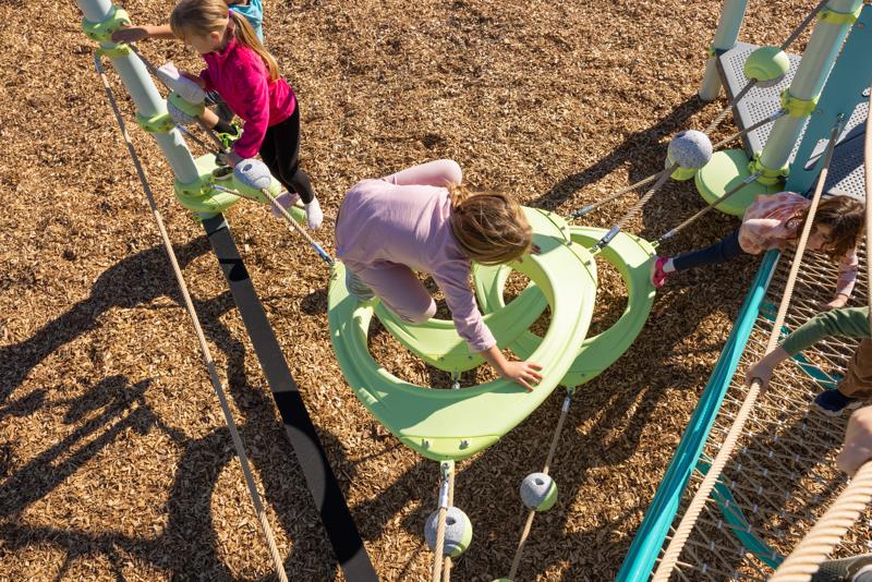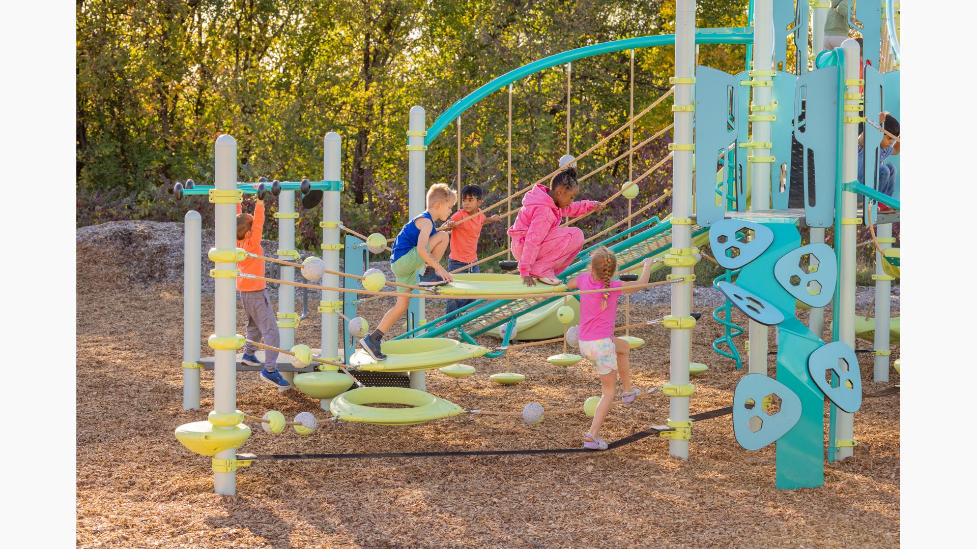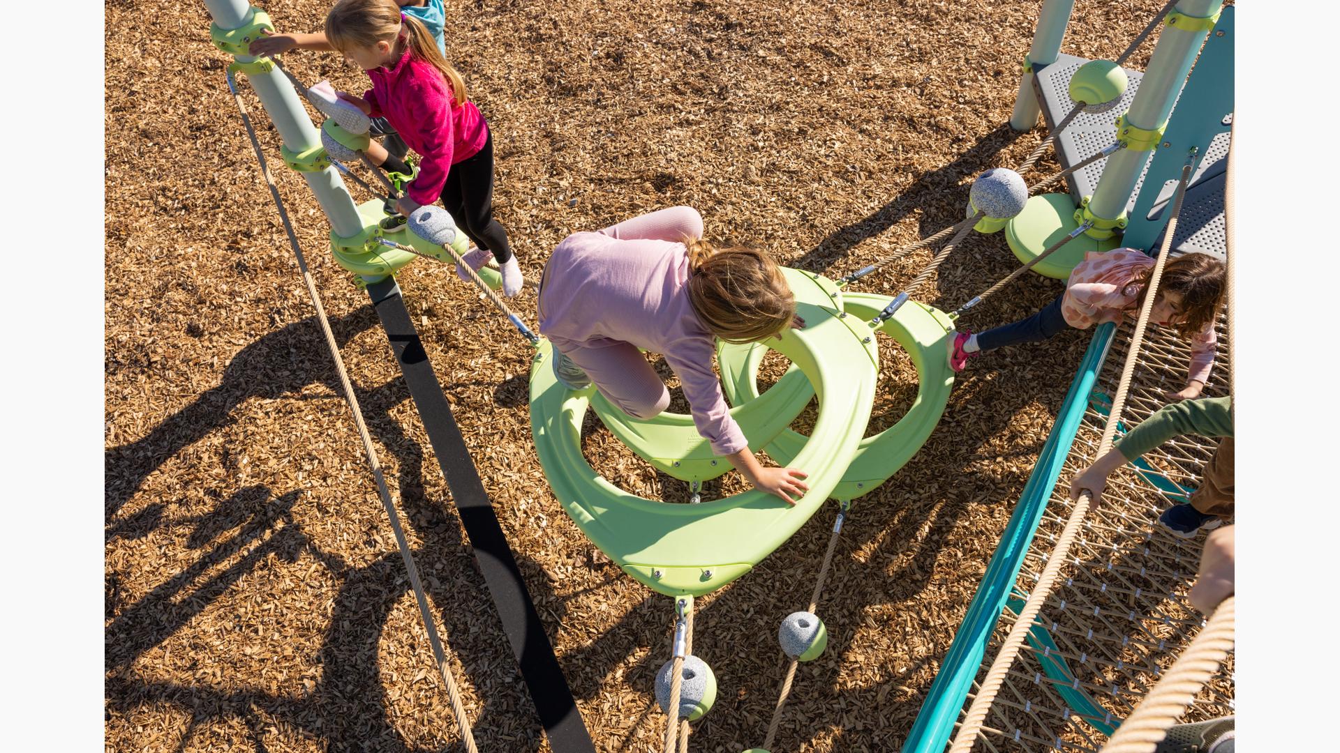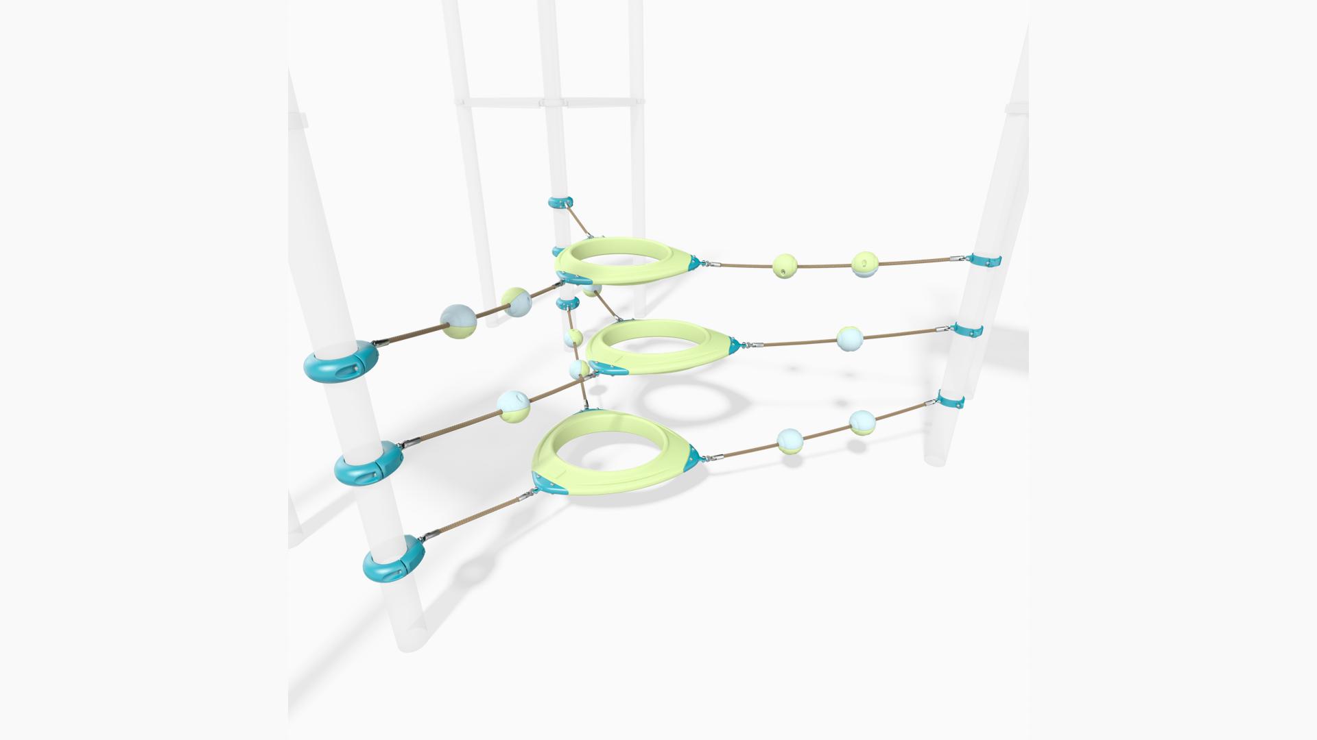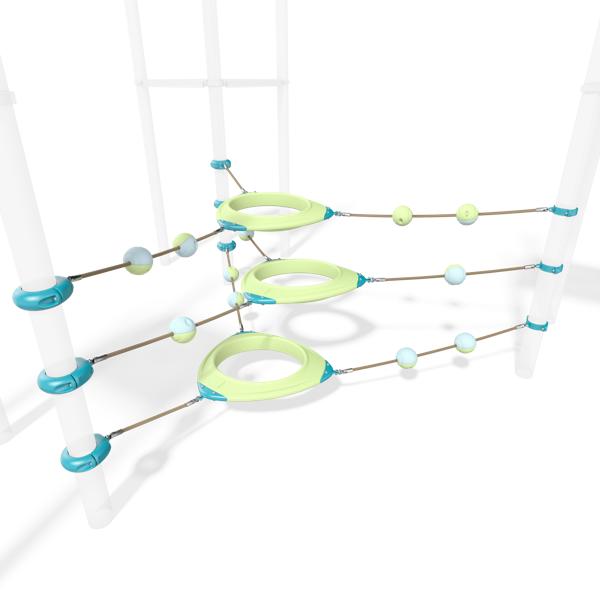 The PlayBooster® O-Zone® Array Climber takes the challenge of the O-Zone to a whole new dimension! This expanded configuration transforms unique, suspended polyethylene rings into an exciting climbing adventure course that challenges kids mentally and physically as they navigate multiple pathways through, over, and around. Whether they're weaving through the center, scrambling over the top, or creating their own route, the O-Zone Array Climber offers endless opportunities for active, creative play.Features