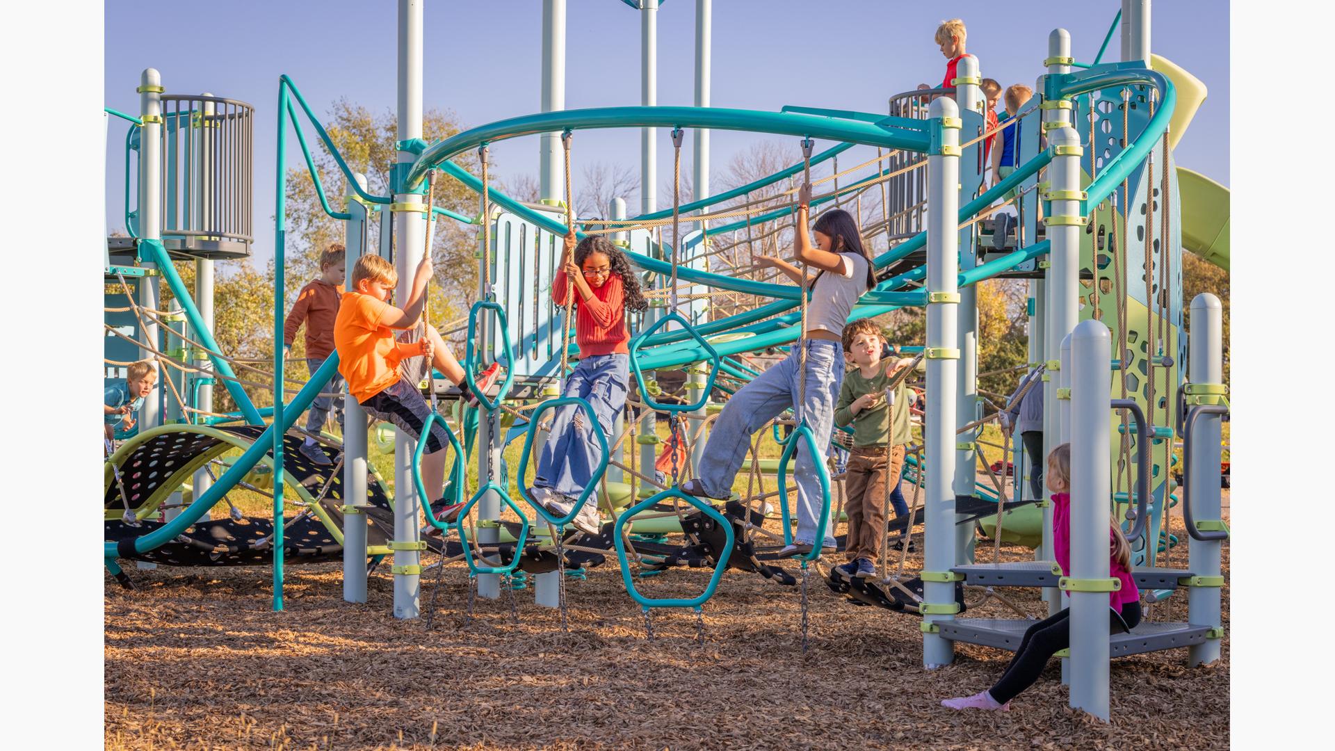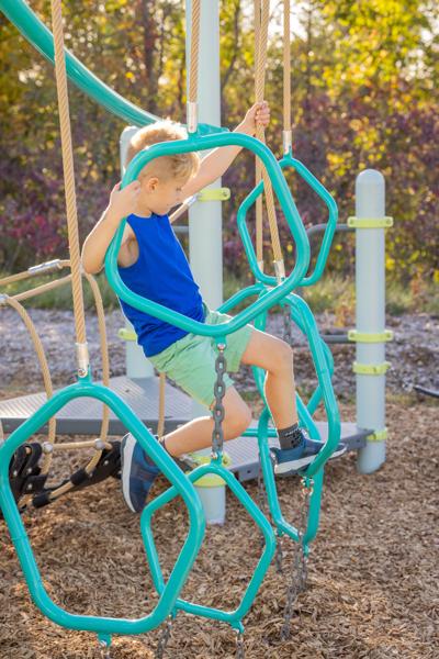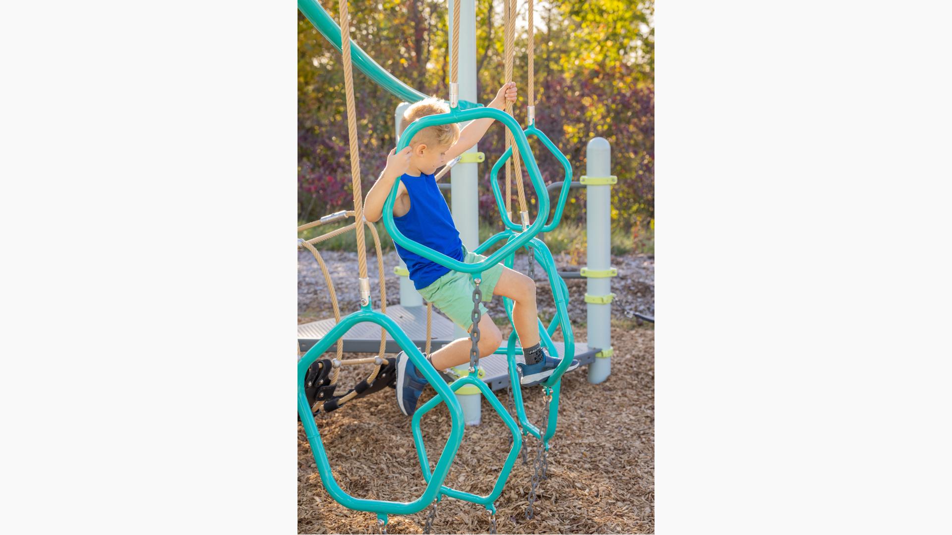 Geometry in motion! Kids can improve balance and depth perception while climbing up down and across the Pentagon Bridge. Geometric loops are attached at different heights to the overhead beam by cables and secured to the ground with chains to control movement.