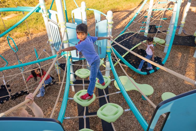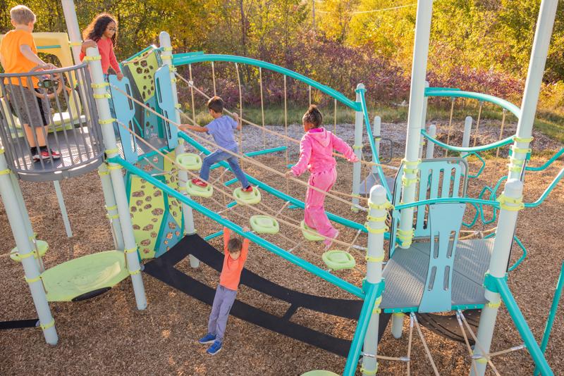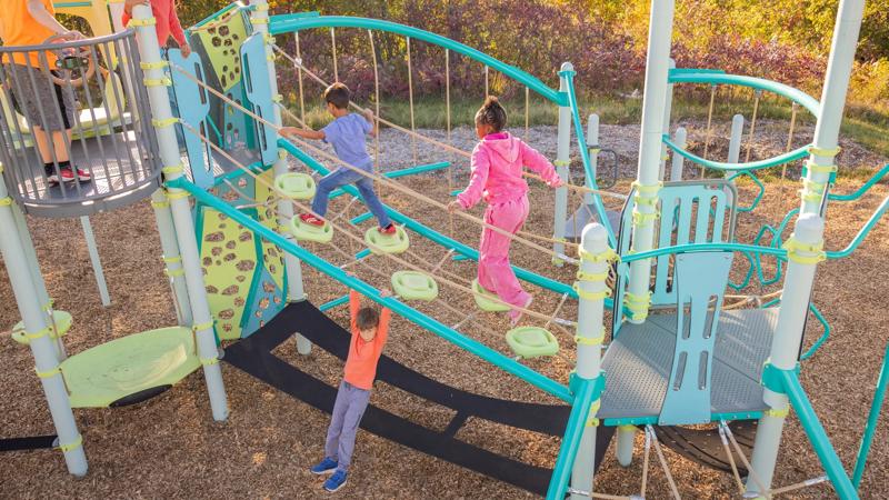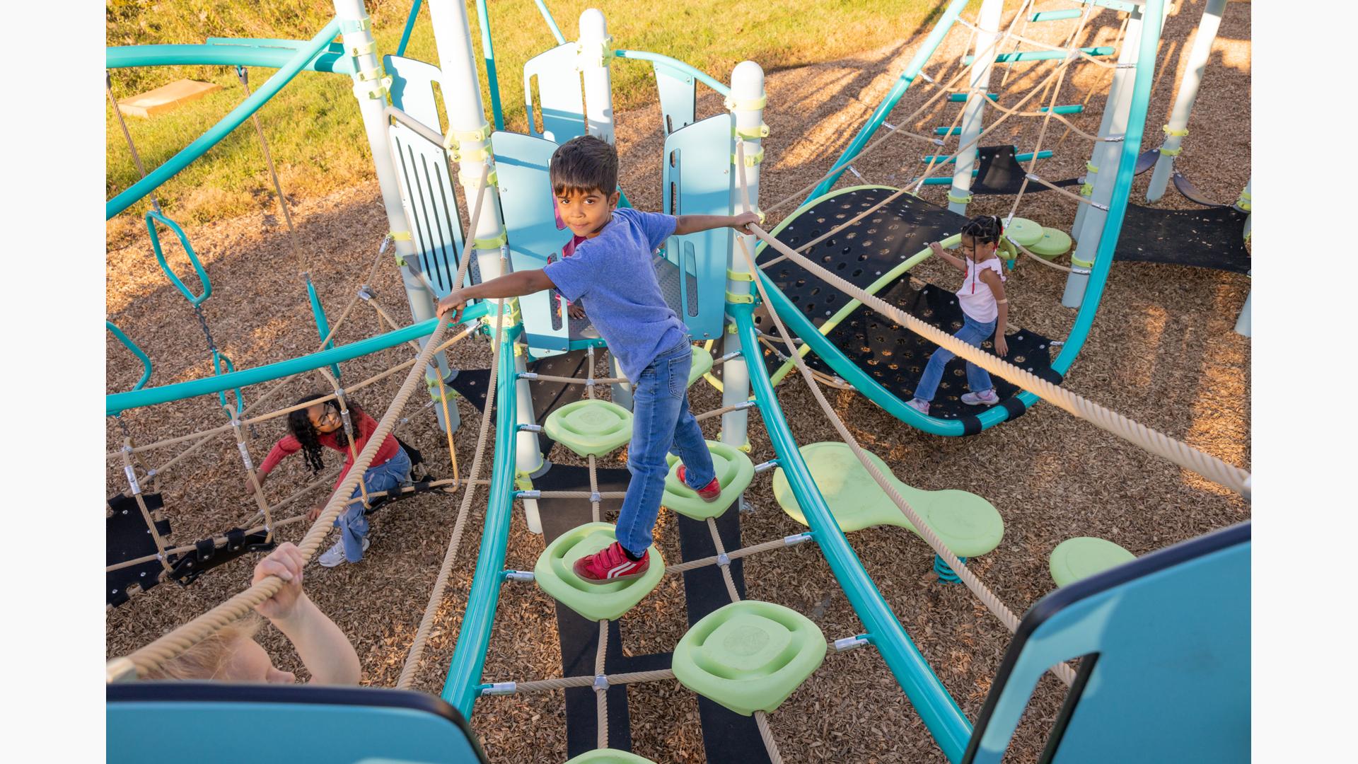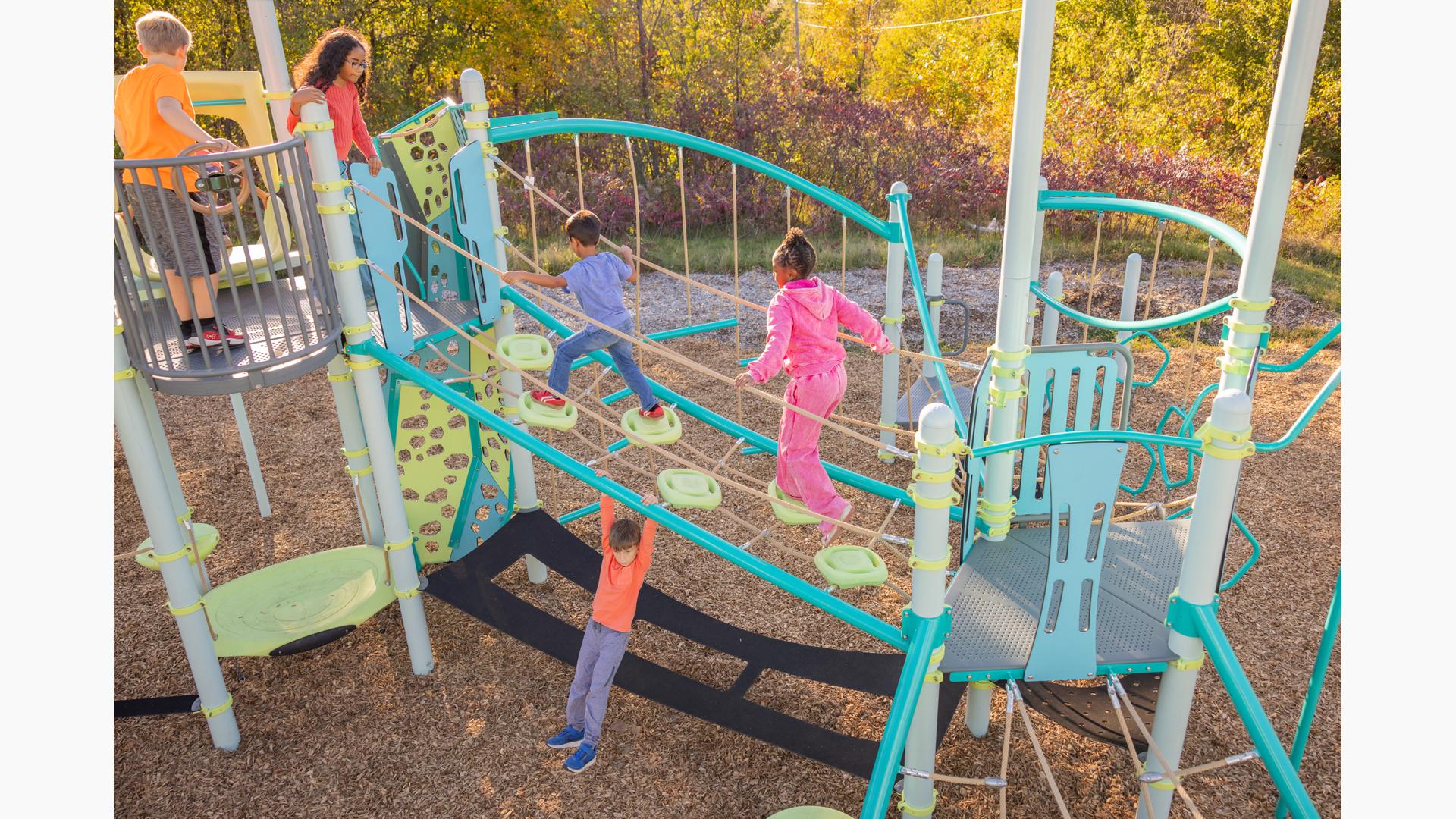 The PodHopper™ Climber creates an exciting aerial adventure that challenges children to navigate across suspended pods and cables. This innovative pod-and-cable combines the thrill of elevated pathways with multiple climbing routes, encouraging kids to explore different ways to move through space. Children can hop from pod to pod, navigate the cables, or find their own creative path across the climber, making every crossing a new adventure.Features