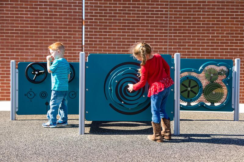 [video: scene fades into three freestanding sensory play panels, Ring-a-Bell, Rain Sound Wheel, and Color Splash panel. The camera zooms in and focuses on the Rain Sound Wheel Panel. The camera switches angles viewing the panels spinning hand wheel. A boy rolls himself to the Rain Sound Wheel panel and begins to spin it clockwise. The inner beads of the panel rattle and move making a rain noise. The camera views across the boy’s knees as he spins the panel. The camera pulls back for a view of a boy in his wheelchair spinning the Rain Sound Wheel panel while another young boy stands at the Color Splash panel. Scene switches to the young boy as he walks over the Rain Sound Wheel Panel and begins to spin it. The camera zooms in on the young boy as he continues to spin the wheel of the panel. The camera switches to the boy seated in his wheelchair as he spins the wheel of the panel. The camera zooms forward into the center of the spiral designed wheel of the panel. Scene switches to a back view of the panel where