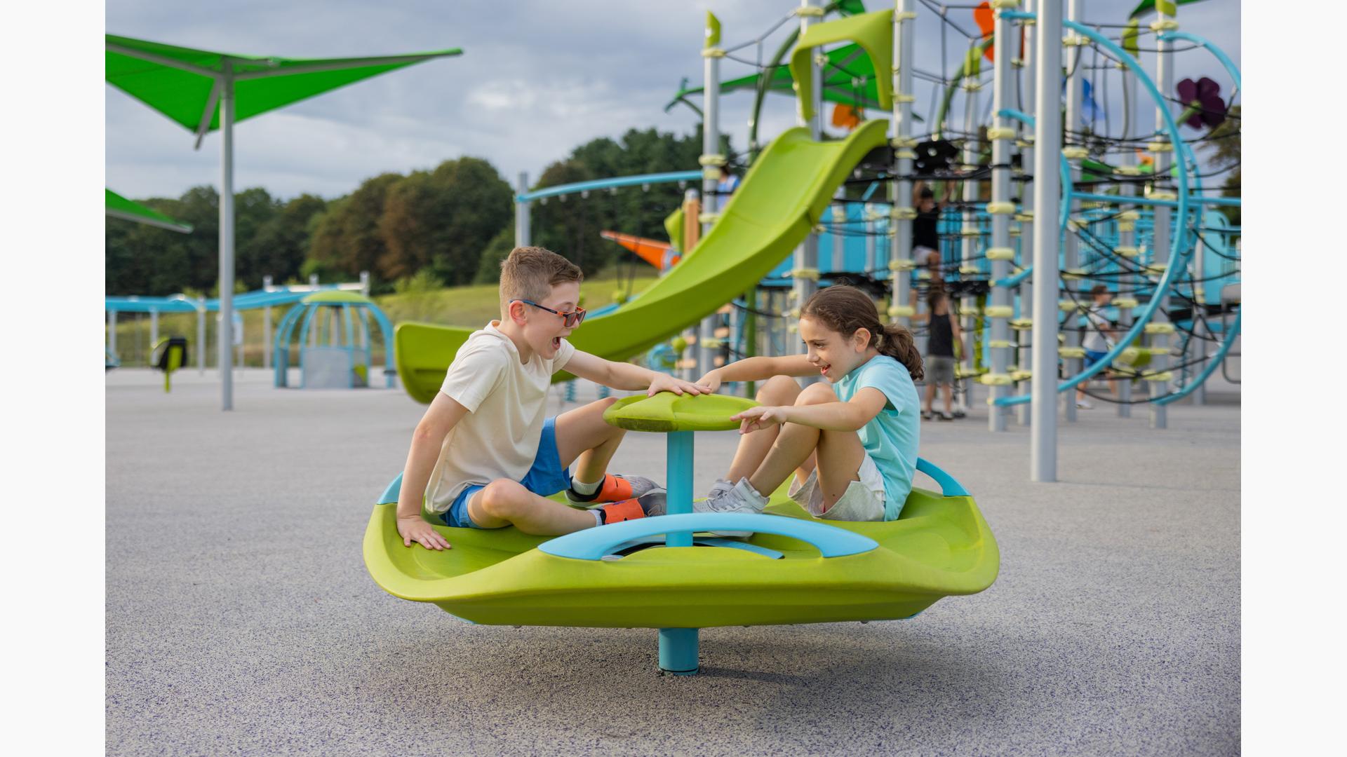 The ReviWheel® Spinner includes a grab wheel in the center so kids can spin themselves around and around. This piece was designed with inclusion in mind with space for one or many kids riding in various positions. ReviWheel’s sculptural form adds an eye-catching flair to any play experience.