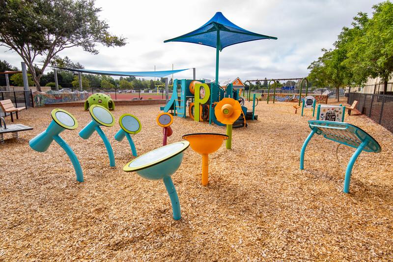 [video: the camera focuses on the boy’s hands as he hits the metal cylinder of the instrument with the hand mallets. Scene switches to a young girl looking out across the play area. She turns to the camera and smiles with an open mouth. Scene fades to the camera zooming up underneath the Ditty Metallophone and coming into focus on a boy’s face through metal bars. He smiles and plays the instrument with the hand mallets. Scene fades into a young girl as she stylishly stands at a playground drum. Scene fades into a top down view of the mallet holder of the Warble Chimes. Scene fades into a top down view of a young girl grabbing the Ditty Metallophone mallets out of their holder. She looks up at the camera.]