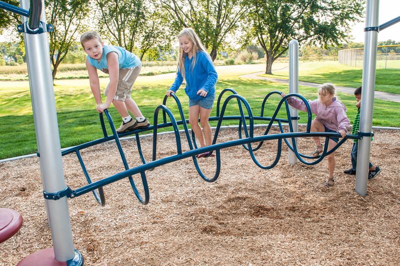 [video: scene fades into a full side diagonal view of a RingTangle Climber at ground level on a PlayBooster playground. Scene switches to a young boy as he climbs over the side arched bar of the RingTangle Climber. A boy walks into frame and begins to climb across the playground monkey bars just in front of the RingTangle Climber. Scene switches to a full side view of a boy as he steps across the wave shaped rungs of the climber. A young girl runs up and begins climbing across behind the boy as another girl swings on the nearby monkey bars. The camera focuses on the girl’s legs as she steps across the climber. Scene switches to a close-up view through the waved shaped rungs of the climber. Children’s legs climb up and across the rungs of the climber. The children giggle as they play. Scene switches to the camera panning up to a boy as he climbs over the arched rungs of the climber. Camera angle switches to a ground view up through the wave rungs of the climber. A girl steps and weaves across the RingTangle Climber. Scene switches to a child wearing a helmet with a mounted camera. The child looks out in front of themselves at the waved rungs of the RingTangle Climber as they step across. The child climbs closer to the end of the climber where two boys play together on the Gyro Twister Spinner. Scene switches to a view down the front of the climber as a young boy weaves around the arched rungs. Scene fades to black.]