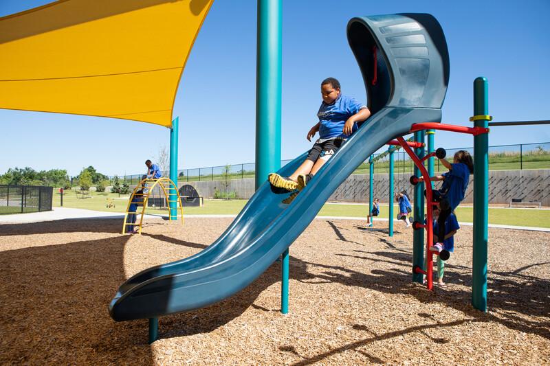 [video: scene switches to an elevated view of the Central Park playground. Children play on the different playground activities in the background as a boy situates himself at the top of the Rush Slide and rides down as the scene fades to black.]
