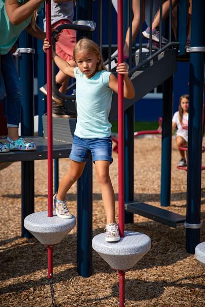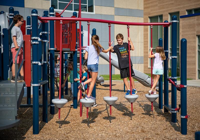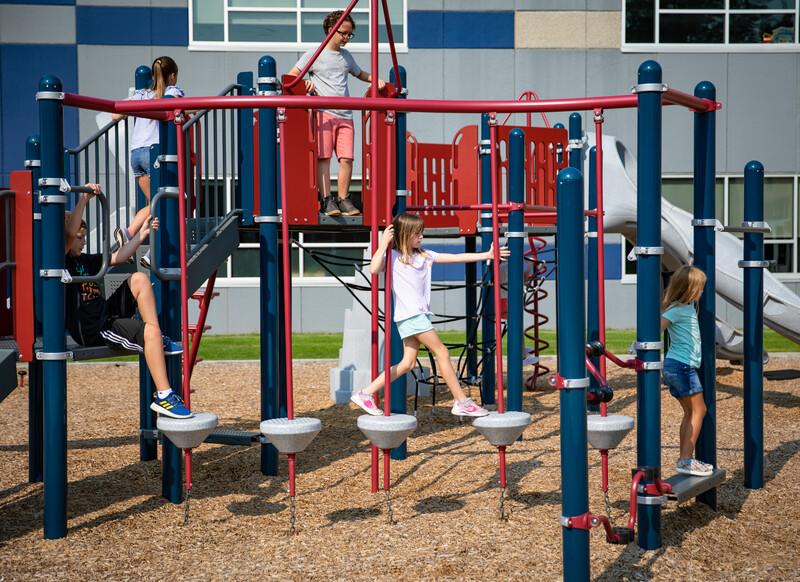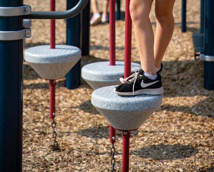 [video: Scene switches to a full ground view of the S-Disc Challenge as a young girl steps across the shifting discs of the playground activity. A line of children wait patiently for their turn on the S-Disc Challenge. Camera switches to a side view of children as they step across tiered disc steps on the S-Disc Challenge. The children giggle as they climb across. Camera switches to a view across the S-Disc Challenge from the playground decking. Children climb across the discs towards the camera. Camera switches to a ground view across the foot disc steppers as children’s feet step across. Camera switches to a ground view up at a group of children climbing across the S-Disc Challenge. Scene fades to black.]