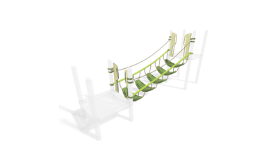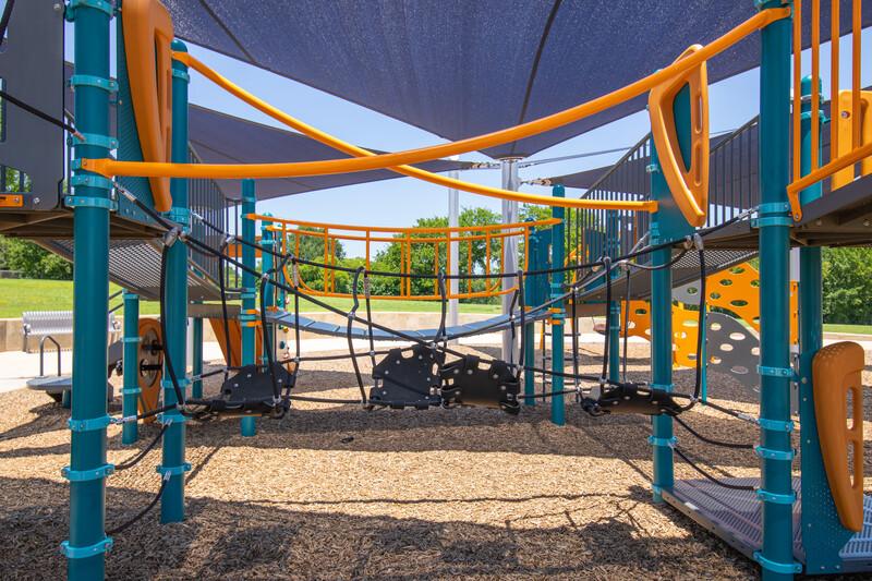 [video: scene fades into a full side view of the Seeker Climber. A boy climbs through the tunneled rope climber with belted stepping zones. Camera switches to a view through the tunneled climber as the boy climbs through towards the camera. Camera angle switches to a front side view as the boy reaches the end of the Seeker Climber. Scene switches to an elevated side view of a boy as he steps across the top of the Seeker Climber ropes. Scene switches to a side close-up side view of the boy as he climbs inside the tunneled ropes of the climber. Scene switches to a close-up side view of the Seeker Climber as a child’s legs climb up onto the ropes of the climber. Camera switches to a view across the play area as children climb on either end of the Seeker Climber. Camera switches to a view through the tunneled ropes of the Seeker Climber of a boy climbing through. Children’s feet can be seen climbing on the outside ropes of the climber. The camera zooms in and focuses on the metal rope connectors of the Seeker Climber.]