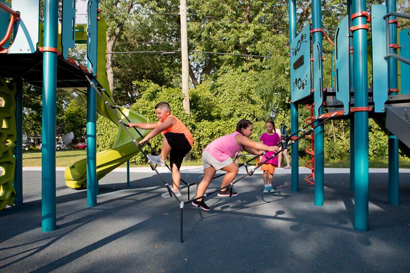 The PlayBooster® Sling Shot Climber™ encourages balance and depth perception as kids climb down and up again.
