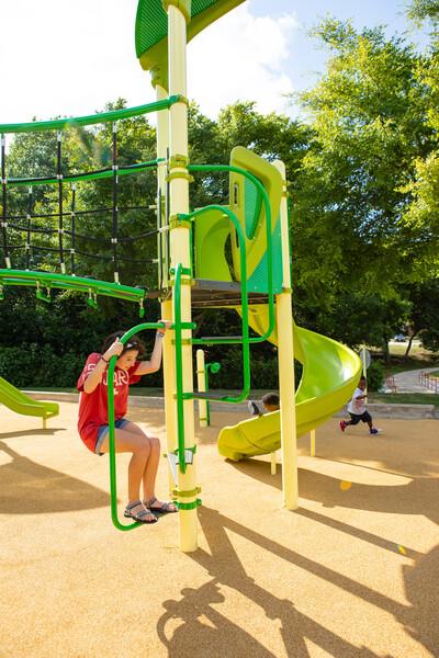 - Uniquely designed laser-cut perforated steel and polyethylene handholds help kids transition from climber to deck
